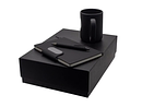 Elegancki zestaw upominkowy zawiera: kubek ceramiczny o pojemności 480 ml, z matowym czarnym wykończeniem i metalowym detalem w kolorze grafitowym (gun metal). Notes 80-kartkowy w kratkę (papier 70 g/m²) w twardej okładce, ozdobiony metalowym akcentem z tasiemką indeksującą. Czarny, aluminiowy długopis z grafitowym klipem, wyposażony w niebieski wkład. Całość zapakowana w eleganckie pudełko prezentowe.